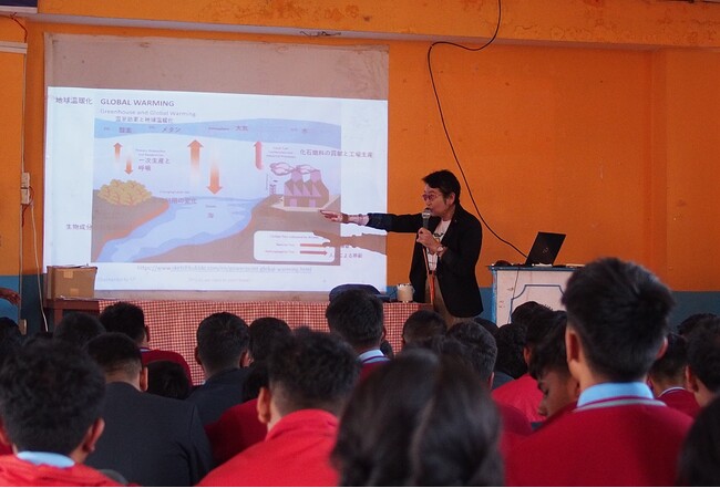講演は日本人メンバーに加え、植樹に参加する The Celebration Co-Ed学校の生徒約150名が熱心に受講し、ネパールの環境に対する生徒たちの意識の高さがうかがえました。