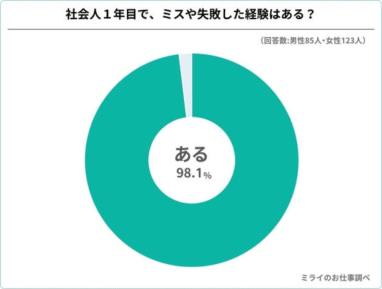 じつに98.1%もの人が、社会人1年目にミス・失敗をしたことがあると回答しました。