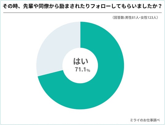 71.1%が上司や同僚に励まされたり、フォローをしてもらったと答えました。