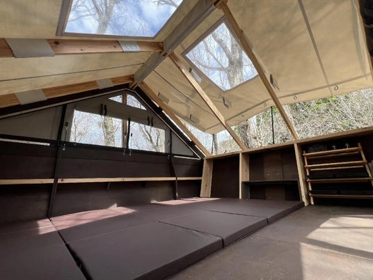 全国20箇所のキャンプ場を運営し、利用者ニーズを熟知する株式会社Recampと、デジタル技術を駆使して、革新的な取組を行う設計集団VUILDが共同開発した「TENT★CABIN」は、テントの「自由」と 建物の「安心」の ちょうど間にあるような心地よさを追求。やさしい印象のしっかりとした木の構造と、大きく開く可動式の屋根からは空間のひろがりや自然とのつながりを強く感じることができます。