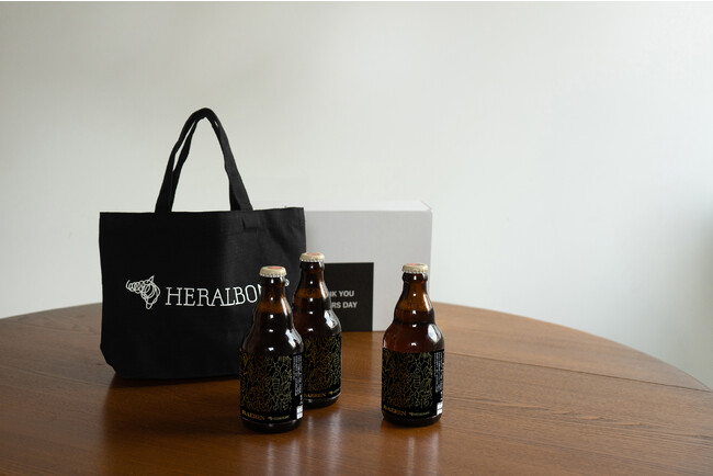 アートのオリジナルパッケージビール3本と、HERALBONYロゴのトートバッグのギフト。40セット限定販売です。(※6/18お届け商品。)