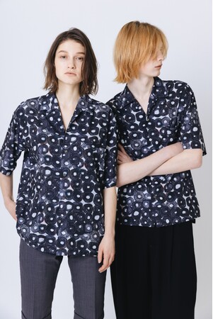 イージーケア性の高いポリエステル素材を使用したドライタッチな質感が特徴のオープンカラーシャツ。シックかつスタイリングに取り入れやすいSanae Sasaki作品をプリントしました。フリーサイズのためジェンダーレスに着用できます。