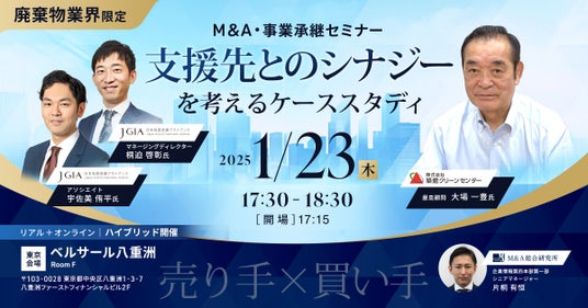 この度、廃棄物業界限定のM&A・事業承継セミナーを実施させていただく運びとなりました。廃棄物・リサイクル事業を展開している株式会社築館クリーンセンターは事業拡大のため、2024年1月にPEファンドである日本成長投資アライアンス株式会社へ株式譲渡をしました。PEファンドへの譲渡を決断した理由や、PEファンドによる具体的な支援内容、今後の成長に向けたさらなる投資について対談形式でお話しいただきます。