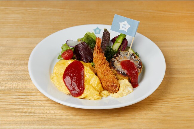 オムライスには、平飼い鶏の卵と有機JAS認定のトマトケチャップを使用。サステナビリティに配慮したエビを使用したエビフライに一部有機野菜を添えた、大人も食べたくなるような贅沢なお子様ランチ。