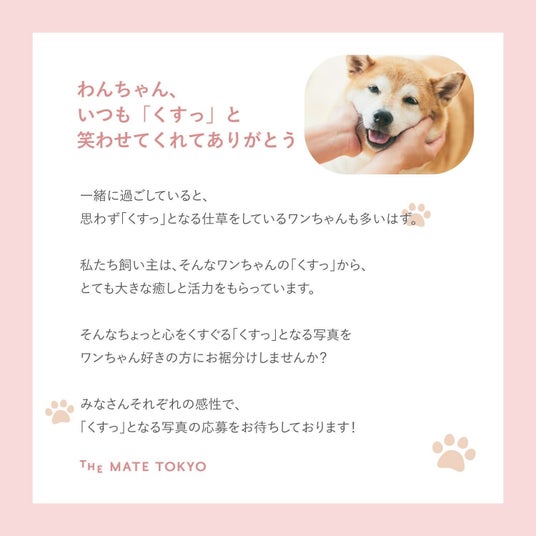 愛するMATE(ペット)への「ありがとう」という気持ちを込めた、ペット向けケアグッズを展開するTHE MATE TOKYO(メイト トーキョー、運営:株式会社SkipSkip、本社:東京都千代田区)は9月14日(土)よりフォトコンテストを開催いたします。Instagramに、愛犬によって心をくすぐられた「くすっ」となる写真を投稿された方の内抽選で10名に、ペットと過ごす毎日が更に楽しくなるグッズをプレゼントいたします。