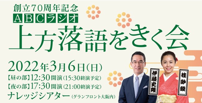 ABCラジオは、3月6日(日)に、創立70周年記念「上方落語をきく会」を開催します。