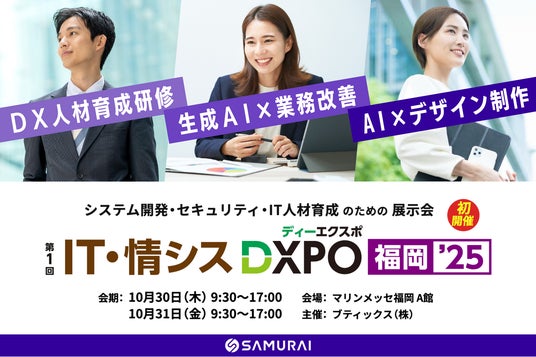 プログラミングスクール『侍エンジニア』を運営する株式会社SAMURAI(本社:東京都港区、代表取締役:羽田 吾立)は、2025年10月30日(木)・31日(金)にマリンメッセ福岡で開催される展示会『IT・情シスDXPO 福岡’25』に出展いたします。