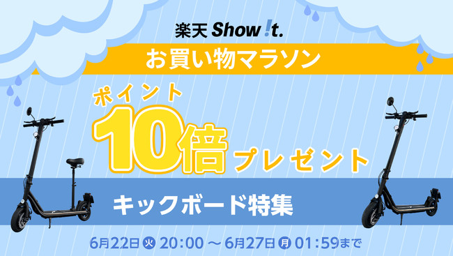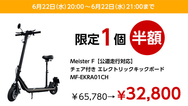 楽天市場「Show !t」は6月22日(水)20時~21時、公道走行対応チェア付き電動キックボードを限定1台半額で販売致します。さらに、ポイント最大10倍プレゼントを実施し、6月22日(水)20:00~6月27日(月)01:59まで開催される、楽天お買い物マラソンに参加します。パーソナルモビリティブランドMEISTER.Fの電動キックボードをご購入のお客様には、10,000円相当のヘルメットと輪行バッグをプレゼント、届いたらすぐに電動キックボードのある生活が始められる、お得なセットです。