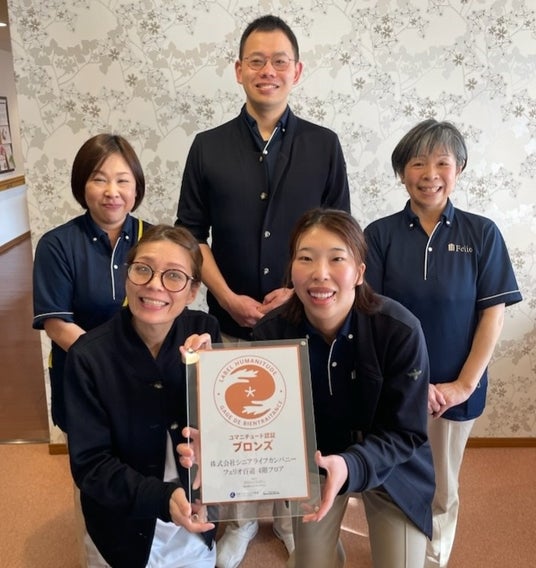 フェリオ百道(4階フロア)は、スタッフ一人ひとりの高い意識と努力によってユマニチュードブロンズ認証取得に至りました。今後も、入居者の皆様に安心して暮らしていただける環境づくりと、豊かな人生の実現に向けての取組みを強化します。