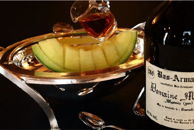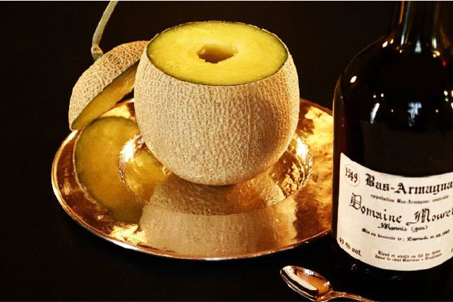 マスクメロンを更なる至高へと引き立てるパートナーは、ホテル川久に貯蔵されているオールドブランデー「アルマニャック-ドメーヌ ムールラ-」。フランスで最も歴史が古く、ルイ14世が生涯こよなく愛したことで知られるブランデー「アルマニャック」の中でも、【ドメーヌ】は単一畑で栽培、収穫、蒸留、熟成、ボトリングまでを一貫して製造される少量生産で希少性の高い一級品で、アルコール度数40%を感じさせない深みのあるまろやかな味わいと、鼻に抜ける高貴で芳醇な香りは年代物ならでは。