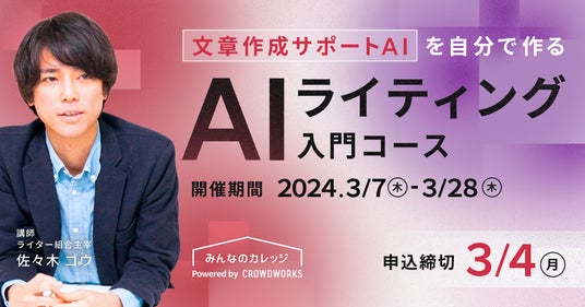 企業と個人をつなぐオンライン人材マッチングプラットフォームを開発・運営する株式会社クラウドワークス(本社:東京都渋谷区 代表取締役社長 兼 CEO:吉田 浩一郎 以下「当社」)が運営するコミュニティ型リスキリングサービス「みんなのカレッジ」は、3月7日(木)よりワーカーのAIスキル獲得を支援するオンライン講座「AIライティング入門コース~文章作成サポートAIを自分で作る~」を開催します。