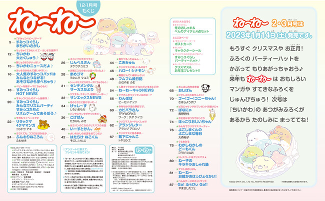 株式会社主婦と生活社は、かわいいキャラクターとふろくが盛りだくさんの隔月刊誌『ねーねー』12・1月号を2022年11月15日に発売します。