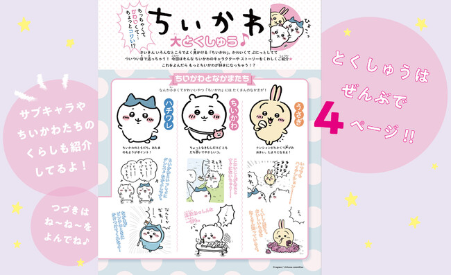 表紙と限定ふろくは、すみっコぐらしの新テーマ「すみっコベビー」(ハート) 今号は「ちいかわシール」や「ちいかわ大特集」が注目です。113名プレゼントにも「ちいかわ」と「コウペンちゃん」が初登場。ぜひ応募してみてね。ポストカード、くみたてあつがみふろく、まちがいさがしは、キュートなすみっコぐらしでテンションが上がります。ほかにも「リラックマ」の描きおろしマンガや「シナモロール」「こげぱん」「いーすとけん。」などなど…かわいくてたのしい連載マンガがいっぱいです。記事ページは、すみっコパッド、すみっコのリズムゲーム、「サンエックス」新情報、「センチメンタルサーカス」最新テーマなど、ぜんぶよみごたえたっぷりですっ!