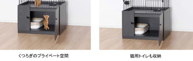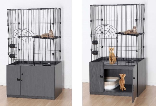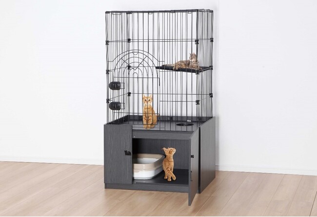 ケージの下にボックス型のパーソナルスペースがついたキャットケージ。ボックス内に、猫用トイレも収納可能。