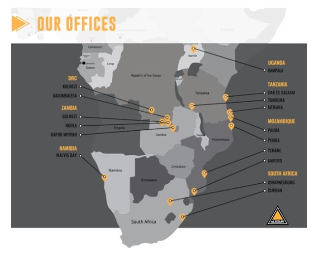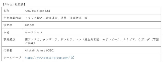 Alistairグループは、サブサハラアフリカの8か国に事業拠点を持ち、アフリカ内陸部のコンゴ民主共和国、ザンビアから産出される銅およびコバルト等の重要鉱物資源を沿岸輸出港にトラックで輸送するクロスボーダー物流を中心に、通関、倉庫運営、港湾での荷役作業、物流DX(デジタル・トランスフォーメーション)サービスも提供。約450台のトラックを保有し、約1,000人の従業員を有しています。