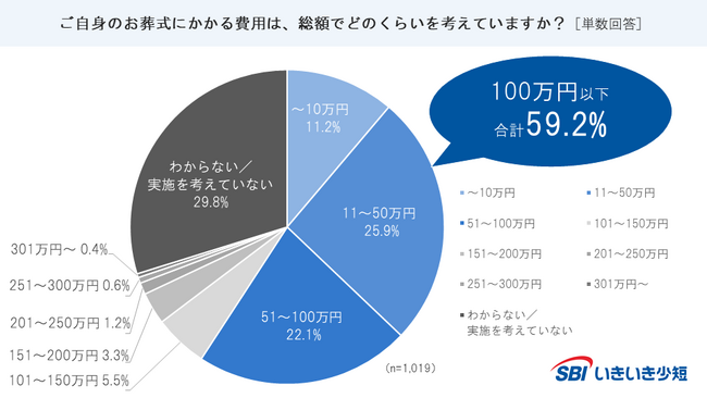 ■自身のお葬式にかかる費用はどのくらいか聞いたところ、「~10万円(11.2%)」「11~50万円(25.9%)」「51~100万円(22.1%)」の100万円以下の合計が59.2%となった。