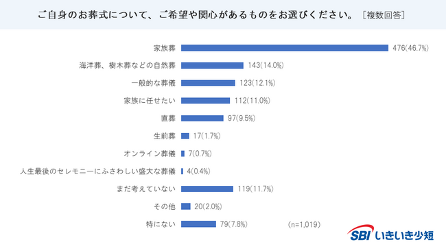 ■自身のお葬式の希望・関心について聞いたところ、「家族葬(46.7%)」の回答が最多。