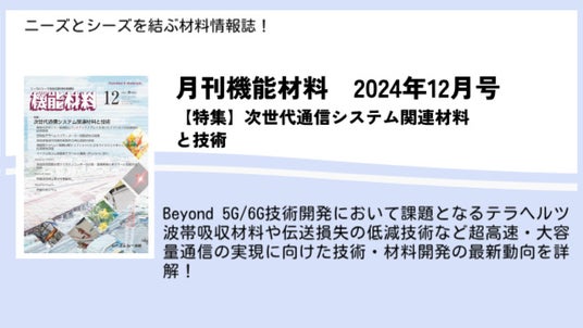 化学・エレクトロニクスなどの技術・市場動向レポート発行を行う、株式会社シーエムシー出版(本社:東京都千代田区、代表:金森洋平)は、雑誌『月刊機能材料2024年12月号』を12月7日に発売します。今回の特集は「次世代通信システムの最新動向」です。伝送損失の低減化やテラヘルツ波帯吸収材料など実用化に向け研究開発が進められる技術・材料についての開発動向を詳解いたします。
