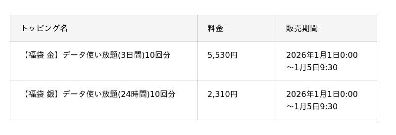 「【福袋 金】データ使い放題(3日間)10回分」(注)を5,530円、「【福袋 銀】データ使い放題(24時間)10回分」(注)を2,310円で提供します。いずれも7回分の料金で10回分利用できるおトクな福袋です。