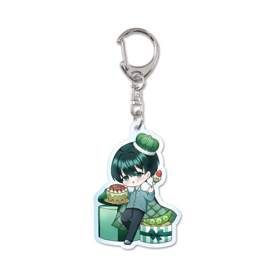 ほまめ誕生日記念の描き下ろしミニキャライラストを使用したアクリルキーホルダー。抹茶ケーキを食べてます。