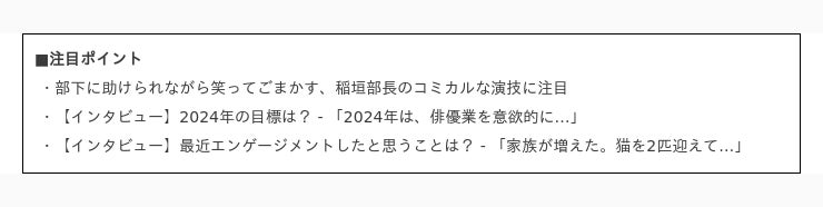 2023年も本当に素晴らしい1年だったので、引き続き2024年も良い年にしたいなと思っています。変わらずと言ったら変わらずという感じなんですが、1日1日を大切にしていきたいなと思いますし、多くの作品に出演していきたいなって思っていますね。2023年は舞台を2作品やらせていただいて、映画は公開がありましたが、撮影はそれほどやってなかったので、2024年は、映画やドラマとかで俳優業を意欲的にやっていきたいです。舞台もまたやりたいですし、さらに濃密な24年にしたいと思っています。 プライベート面では、コロナ以降、外出も減ってしまって、ちょっと出不精になってる自分もいるなと思っていますので、海外旅行に行ったり、外に向けてもっと行動していきたいなと思います。⾊んな人との出会いもありますからね。⾊んな出来事や出会いを求めて2024年は頑張っていきたいなと思います。