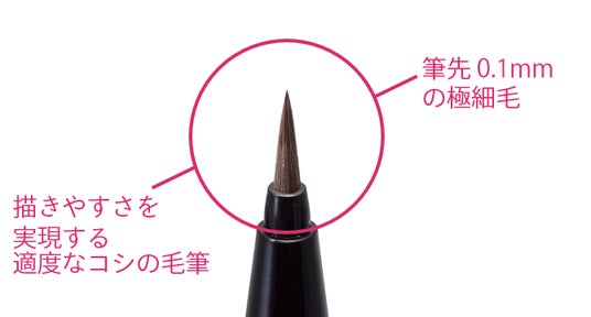 POINT2:筆先 0.1mmの極細筆で感動の描き心地筆先は、0.1mmの極細筆の繊細な毛先と適度なコシでラインの描きやすさにこだわった設計に。目の際のラインも簡単に美しく描くことができます。