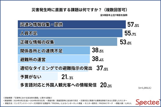 防災テックベンチャーの株式会社Spectee(所在地:東京都千代田区、代表取締役:村上 建治郎、以下「Spectee」)は、自治体で防災・災害対応に関連する業務従事者1000名超を対象に「災害時における自治体の課題」に関する意識調査を行いました。