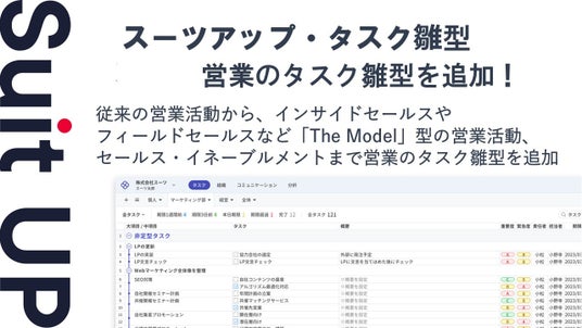 株式会社スーツ(所在地:東京都千代田区、代表取締役社長CEO:小松 裕介)は、チームでかんたん、毎日続けられるプロジェクト・タスク管理ツールの経営支援クラウド「Suit UP」(スーツアップ)に営業のタスク雛型を追加したことをお知らせします。