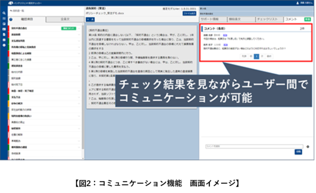 こうした課題の解決に向け、今回あらたに「ユーザー閲覧権限機能」と「コミュニケーション機能」をインテリジェント契約チェッカーに追加することで、営業部門と法務部門の連携を強化し、迅速な意思決定を可能としました。また、後日提供を予定している、対応契約書類型への「工事請負契約書」の追加により、契約書もより幅広いチェックが可能になります。
