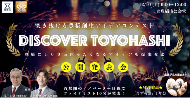 豊橋市(市長:浅井由崇)と一般社団法人INSPIRE(所在地:東京都渋谷区、代表理事:谷中修吾)の共催による豊橋創生アイデアコンテスト「Discover Toyohashi(ディスカバー豊橋)」では、2022年12月10日(土)、豊橋市公会堂で開催する発表会の一般観覧者を募集します。