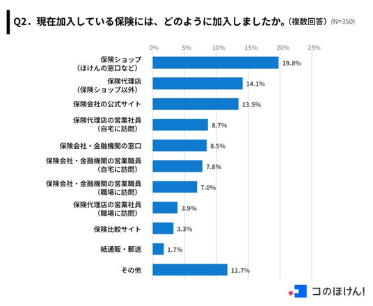 「現在加入している保険には、どのように加入しましたか。」と質問したところ、「保険ショップ(ほけんの窓口など)」が19.8%、次いで「保険代理店(保険ショップ以外)」が14.1%、「保険会社の公式サイト」が13.5%となりました。