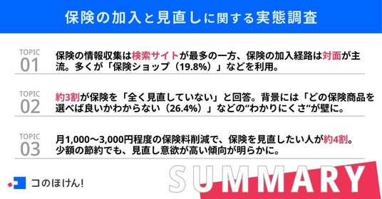 ・約3割が保険を「全く見直していない」と回答。背景には「どの保険商品を選べば良いかわからない(26.4%)」などの“わかりにくさ”が壁に。