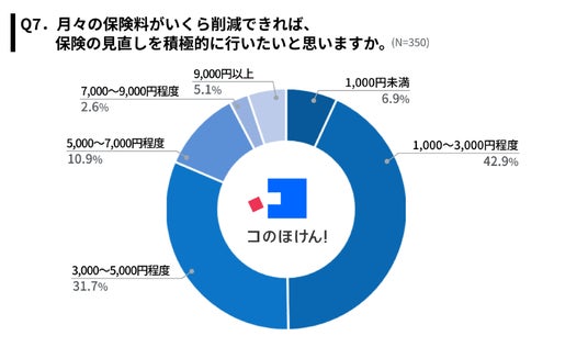 「月々の保険料がいくら削減できれば、保険の見直しを積極的に行いたいと思いますか。」と質問したところ、「1,000~3,000円程度」が最多の42.9%、次いで「3,000~5,000円程度」が31.7%、「5,000~7,000円程度」が10.9%という結果になりました。