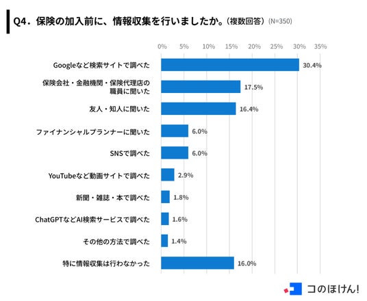 「保険の加入前に、情報収集を行いましたか。」と質問したところ、「Googleなど検索サイトで調べた」が最多の30.4%、次いで「保険会社・金融機関・保険代理店の職員に聞いた」が17.5%、「友人・知人に聞いた」が16.4%となりました。また「特に情報収集は行わなかった」は16.0%となりました。