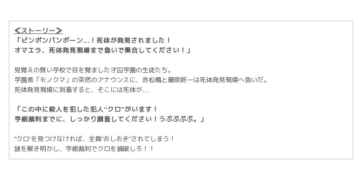 『ダンガンロンパ』シリーズの物語さながらに、 “死体発見現場”をイメージした部屋の中で制限時間5分以内に現場検証を行い(最大2回まで挑戦可能)、次にカフェスペースでじっくり犯人を推理します。最後は“学級裁判”をイメージした部屋のなかで制限時間10分以内に集めた情報と推理を元にクロ(犯人)を見つけだしクリアを目指します。