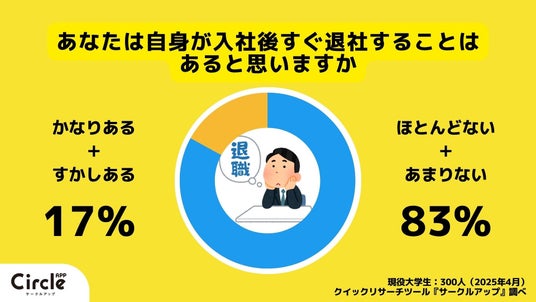 この調査によると早期の退職に共感できる学生が42%と、かなり拮抗した結果となりました。しかし一方で自分自身が早期で退職するようなことがあるか質問したところ、83%が「しない」と回答しました。自身は粘り強く働きたいと思いながらも、社会の風潮として早期退社の判断を認めている学生が多いようです。