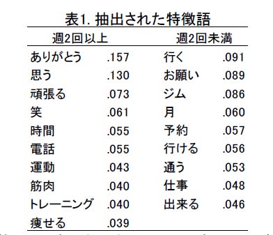 ・来館数ユーザーからのメッセージプロトコルを形態素に分解し、入会後4週間の累積来館数が8回以上のユーザー(週2回以上群)と7回以下のユーザー(週2回未満群)のそれぞれの特徴語を抽出した(表1)。その結果、週2回以上群のメッセージから「ありがとう」が特徴語として抽出された。