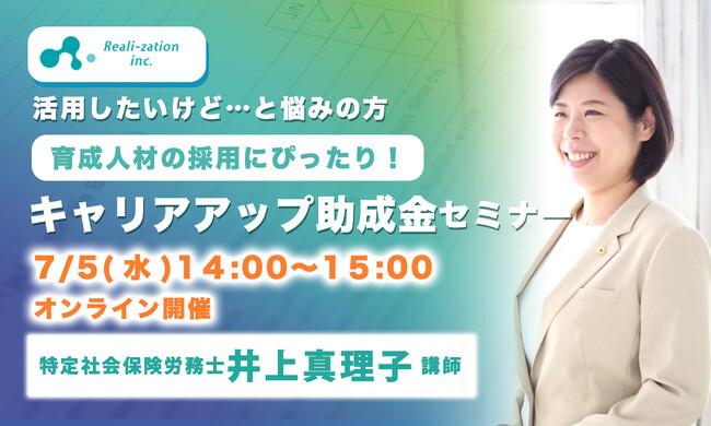 これまでに40億円以上補助金の申請総額と1,000件以上の申請を行ってきた株式会社リアリゼイション(住所:東京都渋谷区渋谷3-6-2エクラート渋谷ビル4F 代表取締役:森垣洋平)は、「育成人材の採用にぴったり!キャリアアップ助成金活用セミナー」と題し、経験豊富な社労士を招き「キャリアアップ助成金」のセミナーを開催いたします。