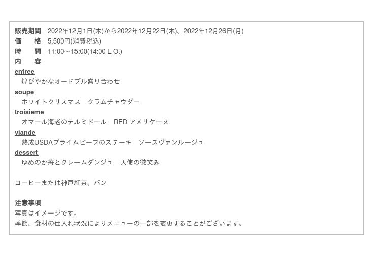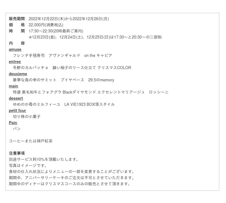 ●2022年12月23日(金)~25日(日)の3日間はランチを臨時休業させて頂きます。