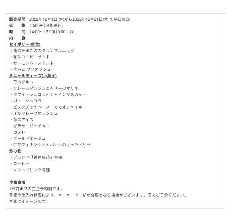 クリスマスに欠かせないフルーツといえばやっぱり“苺”。苺を可愛く美味しくアレンジし、ホワイトショコラなどで華やかなクリスマスを表現しました。ドリンクでご利用頂ける紅茶には、紅茶鑑定士が厳選した茶葉のみを使用したブランド紅茶「神戸紅茶」をご用意。香り高い紅茶と共に、クリスマス期間だけのAfternoon Teaをお楽しみください。