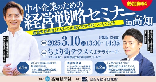 株式会社M&A総合研究所(本社:東京都千代田区、代表取締役社長:佐上 峻作、以下「当社」)は、2025年3月10日(月)に高知県高知市でM&A・事業承継に関するセミナーを実施いたします。