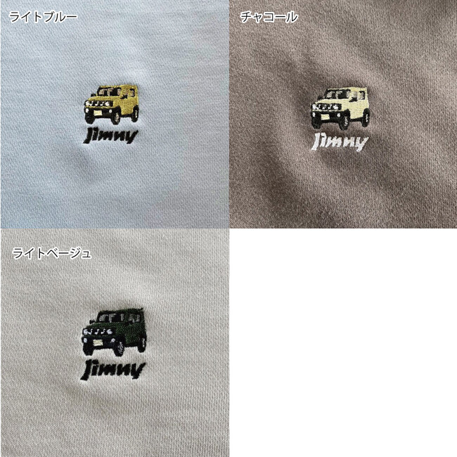 胸元に施された刺繍のジムニーはシンプルながらも目を惹くファッションのワンポイントとなっています。