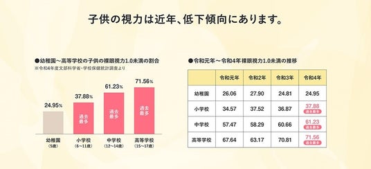 近年、子どもの視力低下が増えており、問題視されています。特に小学生の視力低下の割合が増え、スマホやタブレットの使用が原因と言われています。文部科学省「令和4年度学校保健統計」によると、令和元年から令和4年にかけて、裸眼視力1.0未満の子どもの割合が増加傾向にあります。