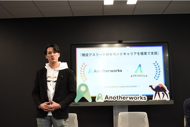 記者発表では、Another worksとセカンドキャリア協会が、2022年8月に連携したことを発表しました。同年10月より、日本スポーツキャリア協会は「athleticaアカデミー」という現役アスリートのセカンドキャリアに特化したキャリアコーチングの提供を開始し、複業クラウドとの連携による就業体験を提供しています。