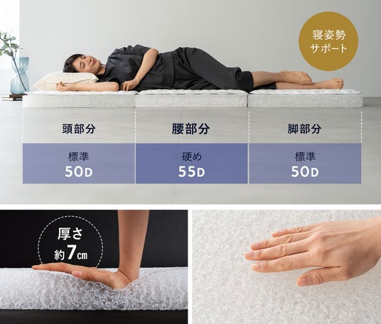 型崩れしにくく耐久性にも優れた3D構造体で腰を支え、寝返りをサポート