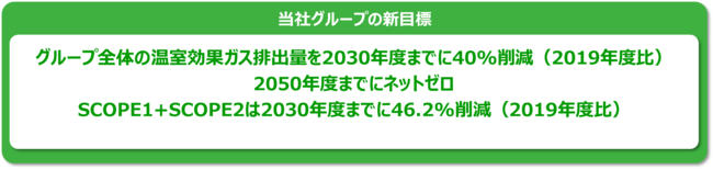 当社は、2020年12月には、当社グループの温室効果ガス排出量の2030年度と2050年度における削減目標を公表しましたが、2021年4月に政府が脱炭素に向けた新たな目標を掲げるなど、気候変動に対するグローバルな関心と対策の重要性が高まっていることを受けて、本年度に新たに策定したグループ行動計画では、2030年度の削減目標をより高く設定した新たな中期目標を掲げています。