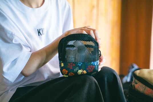 メッシュで中身の見えるパッカブルお着替え収納ポーチ。