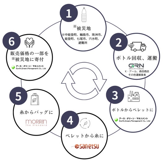 『被災地の回収ペットボトルがリサイクルバッグ。「ボトルtoバッグ プロジェクト」』は、株式会社アース・グリーン・マネジメントが取引先のある被災地・能登を応援したいと立ち上がったプロジェクトです。