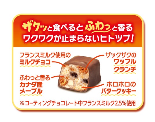 ザックザクのワッフルクランチとホロホロのバタークッキーを組み合わせた心地良いザクッと食感と、口にいれた瞬間からふわっと香るカナダ産メープルがお楽しみいただけるヒトツブに仕上げました。