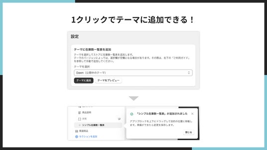 アプリをインストール後、1 クリックでストアへの在庫表アプリブロックを追加できます。難しいコードの編集作業は一切必要ありません。Shopifyの最新のテーマエディターに完全対応しており、ドラッグ&ドロップで好きな位置に配置できます。また、特定の商品や商品カテゴリーにのみ表示するといった条件設定も簡単に行えます。